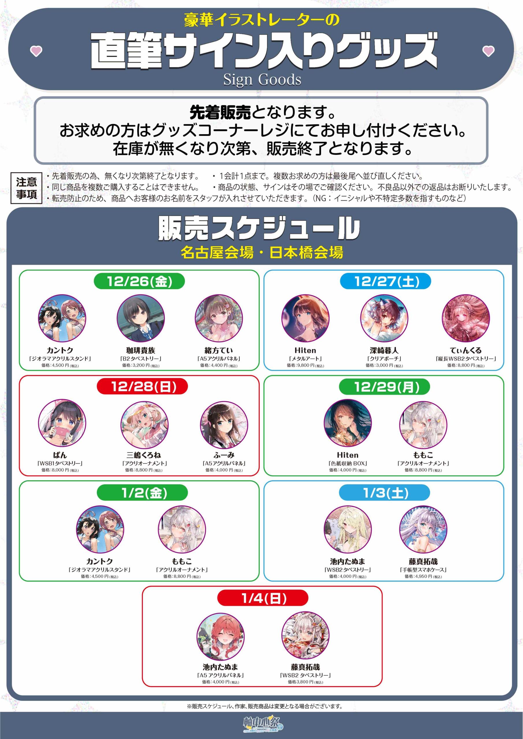 最新グッズ、人気イラストレーターの直筆サイン入りグッズをはじめ、軸中心派オリジナルグッズ満載の大祭典!